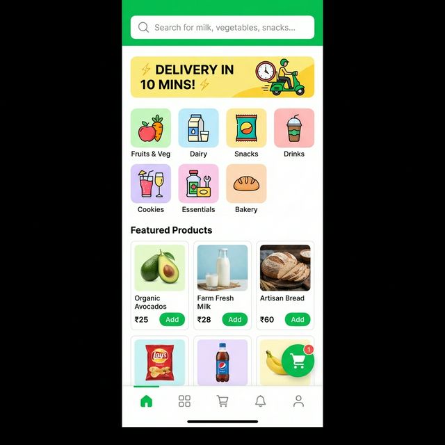 Blinkit-style grocery delivery app with 10-minute delivery promise, inventory management, and delivery tracking.